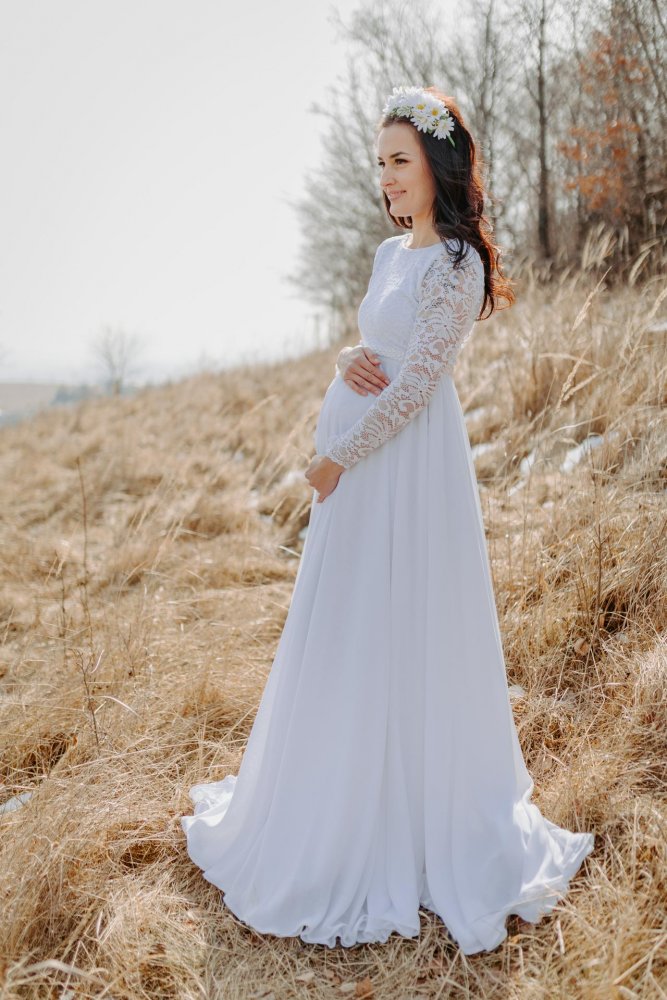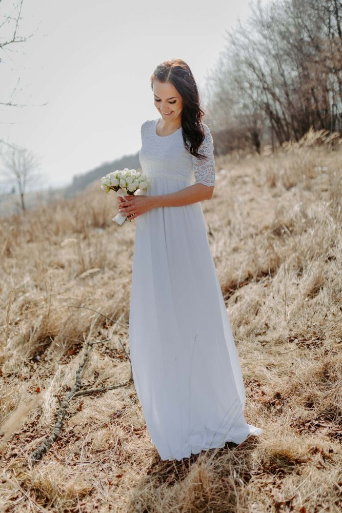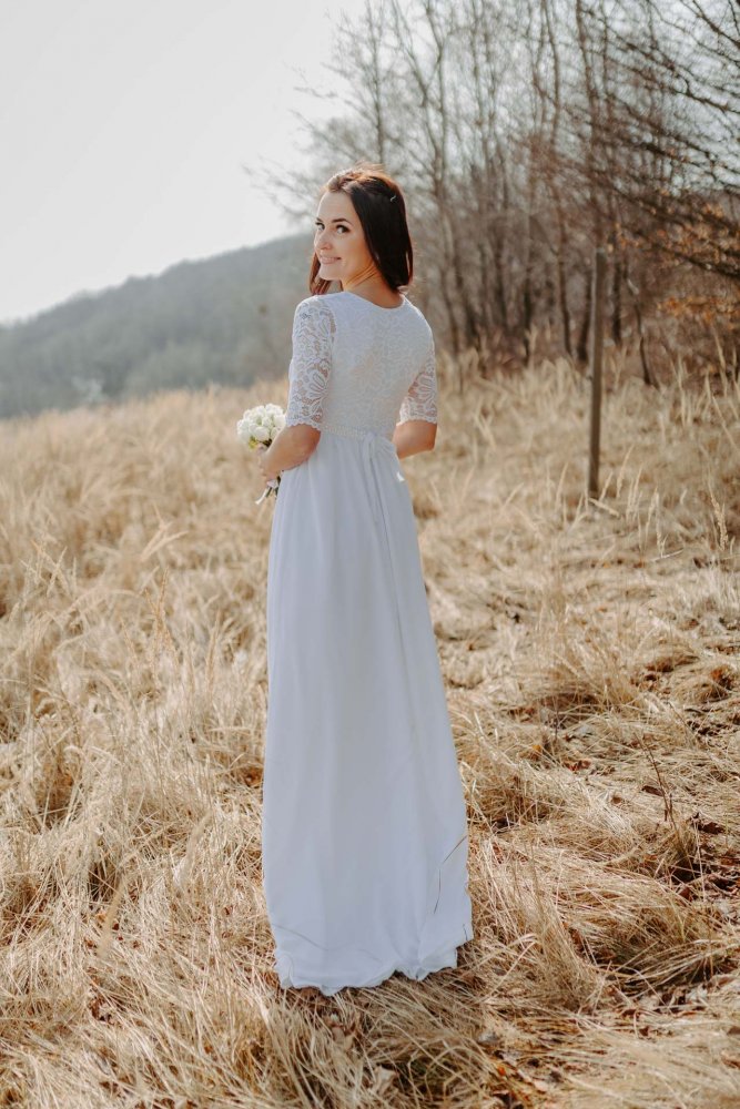 The Mellien dress was initially tailor-made for our first pregnant bride. The important features included the under-bust cut and a skirt connected to the top with a comfortable elastic, allowing the expectant mother to feel maximally comfortable, and the dress easily accommodated her baby bump
