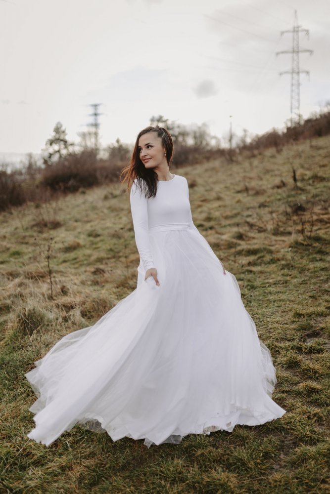 These two models proved to be very successful for us last year, and you loved them. However, I always had another variation in mind, where we wouldn't use lace. After all, not everyone likes lace. I also prefer simpler dresses made of smooth material. Thus, the Tamie Wedding Dress was born - a combination of Lycra and veil tulle that is just as comfortable as putting on a nightgown. These dresses are a perfect blend of comfortable simple wedding dresses with a rich princess-like skirt.